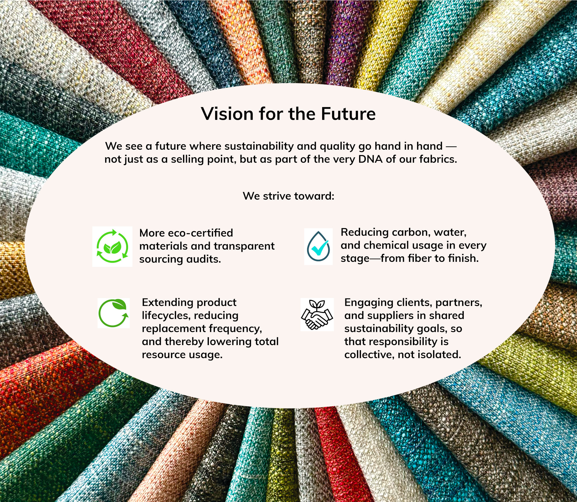 Founded with deep roots in the textile and contract-fabric industry, we understand that what we produce and how we produce it ripple outward touching not only design and comfort, but worker welfare, material footprints, and the health of communities.